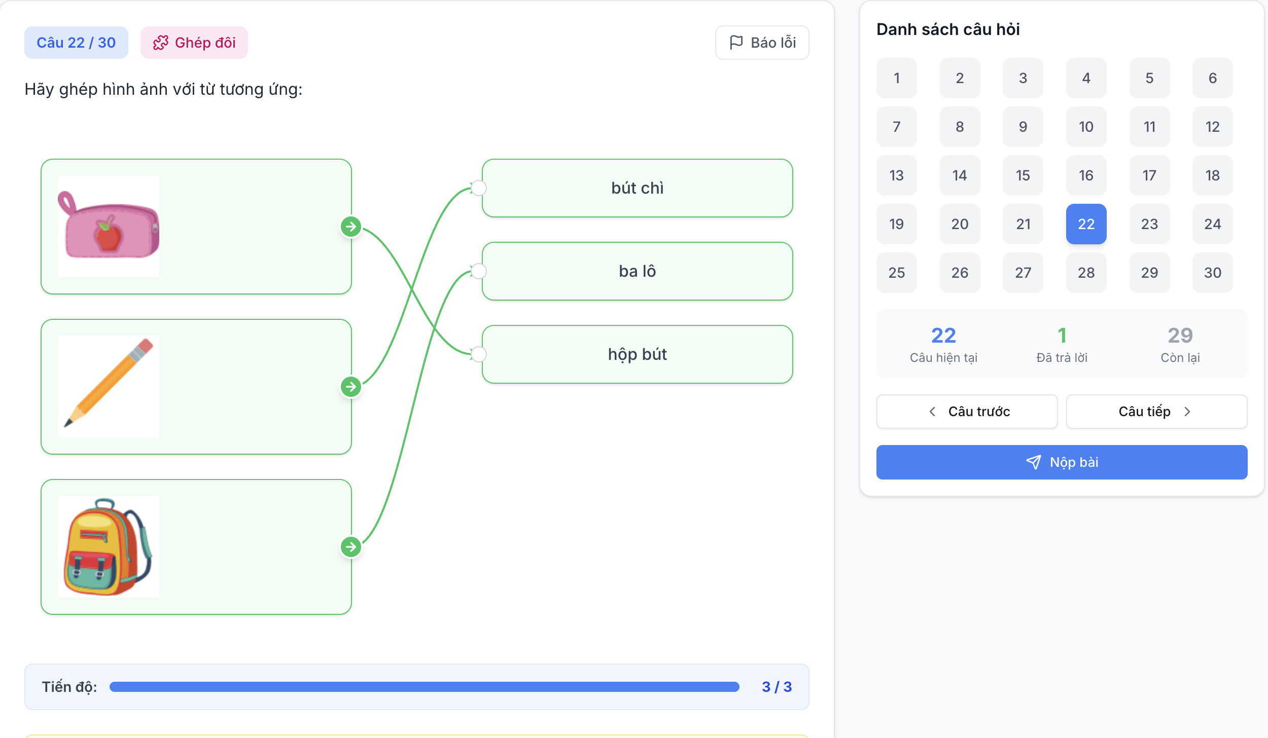 + Kỹ năng thực chiến: Con được rèn luyện phản xạ với các dạng bài đặc trưng như trắc nghiệm, điền từ, ghép đôi, sắp xếp từ thành câu trực tiếp trên máy tính.