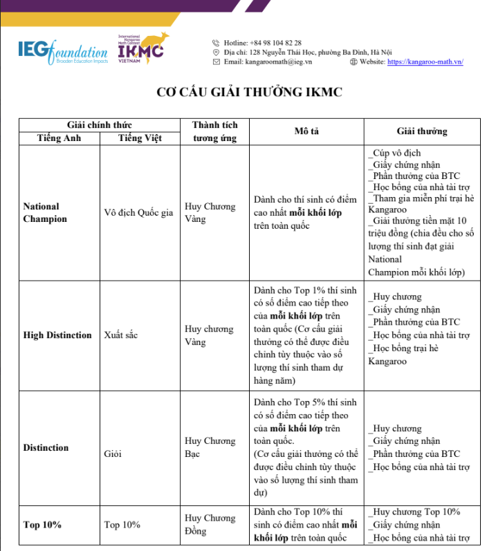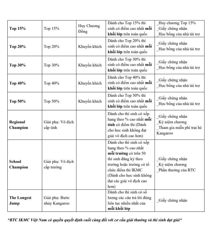 - Giải Vô địch Quốc gia (National Champion): Dành cho thí sinh đạt điểm cao nhất mỗi khối lớp trên toàn quốc.